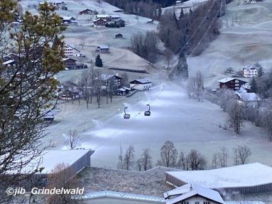 | 今日のグリンデルワルトの天気も、晴れ。 気温は、マイナス1度。 寒む〜〜〜〜い朝である。 気温が下がると、人工降雪機が稼働する。 グリンデルワルト村のスキー場(スキーで降りて来るゲレンデ=コース)には、シーズン前から降雪機によって、人工的な雪を作っている。 勿論、気温がマイナスにならないと雪が作れない。 その人工降雪機が昨夜から稼働した。 |