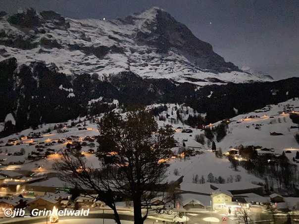 | 写真I 月明かりで明るいアイガーと グリンデルワルト村。 (01月31日 撮影) |
