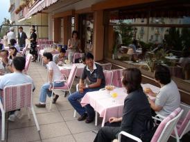 | 写真@ 07月13日の午後5時ごろ。 ツアー参加者12名を乗せたバスが到着。 午後7時より、「歓迎アペロ」が催されま した。 |