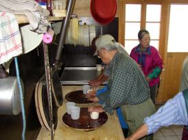 | 写真@ 07月17日は、「オリジナル・チーズ作り 体験コース」です。 早朝のバスでガスの中、アルプへと上がり、 酪農家にて本物のチーズ作りを体験します。 約340リットルものミルクが入った大きな 銅鍋を暖め、攪拌します。 |