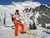 | 今日の天気も、晴れ。 「BE−PAL」の取材は、昨日で終わったのだが、どうしてもヴェロゲメルの工場を見たいとのことなので、月曜日の 今日、朝から連絡を取って、工場を見学+取材に行った。 ヴェロゲメルを作っているのは「Rubi」木工所であり、本業は家の窓枠やドアー、大きな棚やテーブルなどを作って いるそうだ。 ヴェロゲメルは、1911年04月01日に「クリスチャン・ビュールマン」というグリンデルワルトの木工屋さんが冬の 時期の足として考案し、パテントを取ったもの。、今では年間に100組ほど作っているそうだ。 現在の販売価格は、450フラン(約42750円) 「日本での販売はしないの?」と聞くと、郵送費、税金その他の経費などが掛かるので、本体と同じくらいの料金に なるので売るのは難しいだろう・・・との返事だった。 なお、注文を受けてから約2週間で発送するとのことである。 「Rubi」木工所のHPは、 http://www.velogemel.ch/ |
