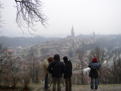 | 今朝はフライブルグに居る。 今日も低い気温だった。 ガスが街の中に垂れ込めているために、フライブルグでの撮影を中止し、ベルンへ向う。 今夜からの宿泊ホテル「ベルビューパレス」に荷物を降ろし、そしてベルン市内の撮影に向う。 (お陰さまで、5つ★クラスのホテルに宿泊させていただきます。 おやじは、ちょっと気温を甘く見て、薄着で出かけたら、街中の撮影が長時間に渡るために、身体が寒くなり、結構 しんどかった。私はもちろんのこと、スタッフの方々も寒い時間を過ごしたと思う。 普段、グリンデルワルトなんかでは、標高が高くても太陽が出るので暖かいが、ベルンでは殆どがガスの中。 気温はグリンデルワルトよりも高いと思うが、風が冷たくて、体温も低くなるので寒いのだろう。。。 取材は、ベルン市内を歩きながら、11個の噴水や熊公園、バラ公園からの景色(ベルンの町並み)等を撮影する。 |