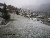 | 今日のグリンデルワルトの天気は雪。 午前08時15分の気温は、+3℃。 今シーズン最初の雪降り天気。 (毎年09月下旬とか10月上旬に一度は雪が降りますね) 研修旅行の翌日。 いろんなメールや手紙がたまって届いている。 1日雪は降り続き、グリンデルワルト村内でも真っ白に。 (といっても、根雪にはならない。太陽が出ると、あっと言う間に溶ける雪である) |