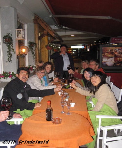 | 今日のグリンデルワルトの天気は、朝から晴天。久しぶりの晴天!! 午前07時45分の気温は+8℃。 すがすがしい良い天気。やっぱり、晴れなきゃスイスじゃない!?(笑) 夕方から、ホテル・クロイツ&ポストのバーと共同で弊社のオープン記念アぺロを行なう。 夕方から、あいにくの夕立が降り始めたが、それでも、多くの知人、知り合い、工事関係者が集まってくれた。 (総勢60〜70名の地元民が集まってくれた=村民全員に招待状を送ったわけではないのだが・・・) ホテル・クロイツ&ポストのオーナーと、弊社の安東康代の挨拶があり、参加者たちから多くの拍手を浴びる。 ホテルからはワインやスナックを用意し、弊社からは日本酒、巻きずしや春巻き、つまみなどを用意し、参加者たちが競って食していた。 結局、午後6時からのアペロは、午後10時ごろに一旦終了し、その後、ホテルのレストランに場所を移して二次会へ。 家に戻ったのは、午前01時ごろだった。。。 そして、おやじは酔っぱらってしまった。。。。(苦笑) |