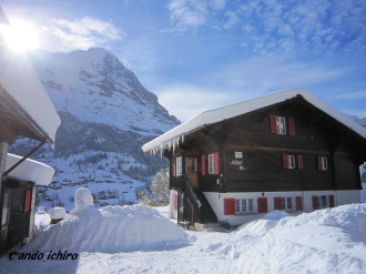 | 午前07時45分のグリンデルワルトの天気は曇り。気温はマイナス7℃。(寒いなあ〜〜) 今日は、朝から日本へ帰国される2名のお客様を車でチューリッヒ空港にご案内する。 道路は空いていて、事故も渋滞もなく、スムーズに2時間ちょっとで到着する。 写真は昼間のグリンデルワルト駅前の風景と我が家「シャレー・アイーニ」です。 1階部分は貸し別荘として利用して頂けます。目の前にはアイガー北壁が聳えています。 夏まで予約でほぼ一杯ですが。 宿泊ご希望の方は、お問い合わせください。(笑) |