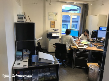| 今日のグリンデルワルトの天気も晴れ。 新しい事務所はグリンデルワルト鉄道駅前にある。 郵便局の2階である。 今までのように案内カウンターがないので、何も知らない観光客は普通にやって来る。 事務所なのを見て少しびっくりされるが、観光案内の説明を受け、必要な乗車券(切符)類を購入して、そして観光に出かける。 天気予報や時間の余裕などを聞いてから観光に行く。 何も知らないで行くよりも、効率は良いし、現地の情報がよく分かっている我々からのアドバイスは貴重だろう。 |
