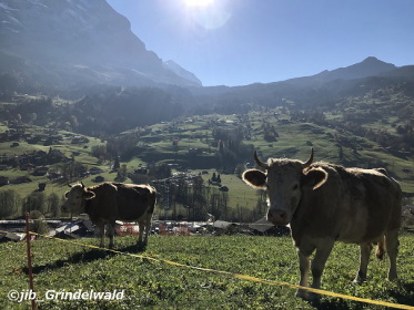 | 今日のグリンデルワルトの天気は晴れ 我が家の周辺は牧草地だが、ふもとに下りて来た牛さんたちが、たくさんやって来ている。 その牛さんたちの首に付けている「カウベル」が、ガラ〜〜ンゴロ〜〜ンと、24時間鳴っている。 まあ、私は慣れているが、慣れていない観光客にはうるさいだろうな〜^と、思う。(笑) |