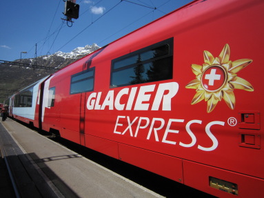 | 今日のツェルマットの天気も、晴れ。 モンベル社の辰野会長やスタッフの方々と別れて、ツェルマットを去る。 帰りは、フルカの新トンネルを通っての異なるコースでグリンデルワルトへと向かう。 夏はフルカ峠の道がオープンしているが、冬は雪で通行止めなので、「新フルカ・トンネル」をカートレインを使って越える。 あの有名な「氷河急行」は、昔の路線で「ローヌ氷河」を見ながら走っていたので、その名が付いたのだが、「新フルカ・トンネル」の開通により ローヌ氷河を見る事が無くなったが、電車の名前として残っている。 |