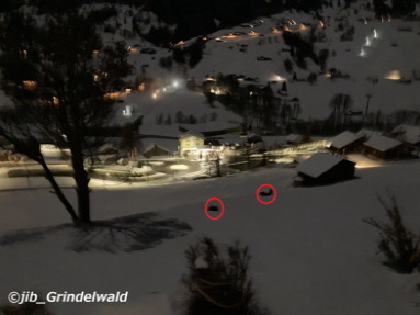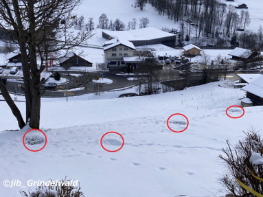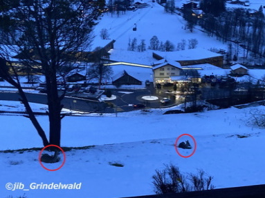 | 今日のグリンデルワルトの天気は、曇り。 気温は、+6度。 うっとうしい天気が続く。 気温が高いので、周辺の雪も溶けている。 これからまだ気温が下がって雪も降るだろうが。 我が家の庭に、いつもの鹿の家族(?)が、2〜3日に1回の割合で深夜から早朝にかけてやって来ては、 我が家の庭で休んでいる。(苦笑) そして、いつも決まった場所に、決まったように鹿が座っている。 なんとかく、父親、子供達、そして母親の順番で座っているような気がする。(苦笑) |