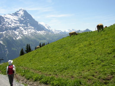 | フィルスト〜バッハアルプゼーの途中(後方は、アイガーとユングフラウ) | フィルスト〜バッハアルプゼーの途中(後方は、アイガー)牛も出ています。 |