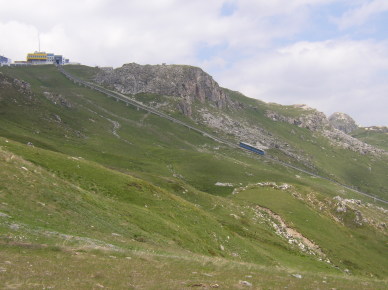 | 「コルヴィリア」と「チャンタレラ」間を結ぶケーブルカー(青色) | 「サン・モリッツ」を見ながらの昼食 |