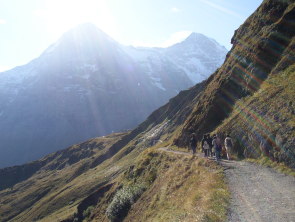 | ハイキング中のショット(前方は「アイガー」と「メンヒ」) | 中間点で(後方の山は「ヴェッターホルン」) |