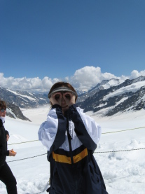 | サングラスを忘れた添乗員さん (写真掲載がお約束なもので。。。笑) | スフィンクス展望台から見たメンヒ(4099m) |