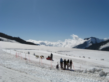 | 「犬そり」に乗るため、待つ客たち | ヨーロッパ最大の「アレッチ氷河」(世界遺産) |