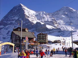 写真E ラウバーホルン山頂から見た 「アイガー」「メンヒ」と クライネ・シャイデック駅。 (02月01日撮影) |