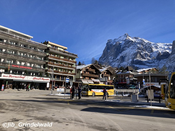 | 写真A 駅前のバス・ターミナルと、 ヴェッターホルン (標高3、692m) (02月03日 撮影) |